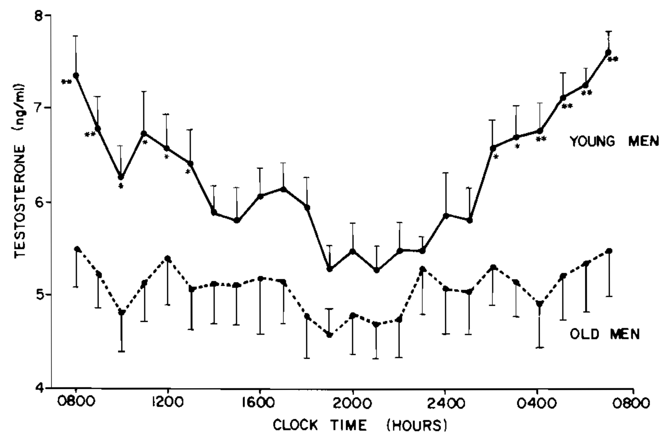 It shows the hourly mean (average) of total testosterone in young and old men (from Bremer 1983). The 17 young men studied were 23-28 years old and the 12 old men were 58-82. They were ‘normal’ men. What is interesting is that the change of testosterone level in one hour shown in the chart above can be as much as the ‘significant’ change in the vitamin D study after a year.